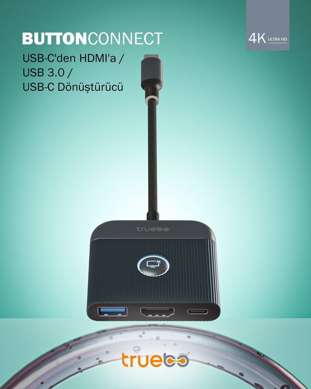 ButtonConnect 3ın1 Type-C, USB, HDMI bağlantı cihazı. Çoklu Bağlantı İstasyonu USB-A 3.0 5Gbps, Type-C, HDMI PD100W; hızlı ekran görüntüsü açma/kapama