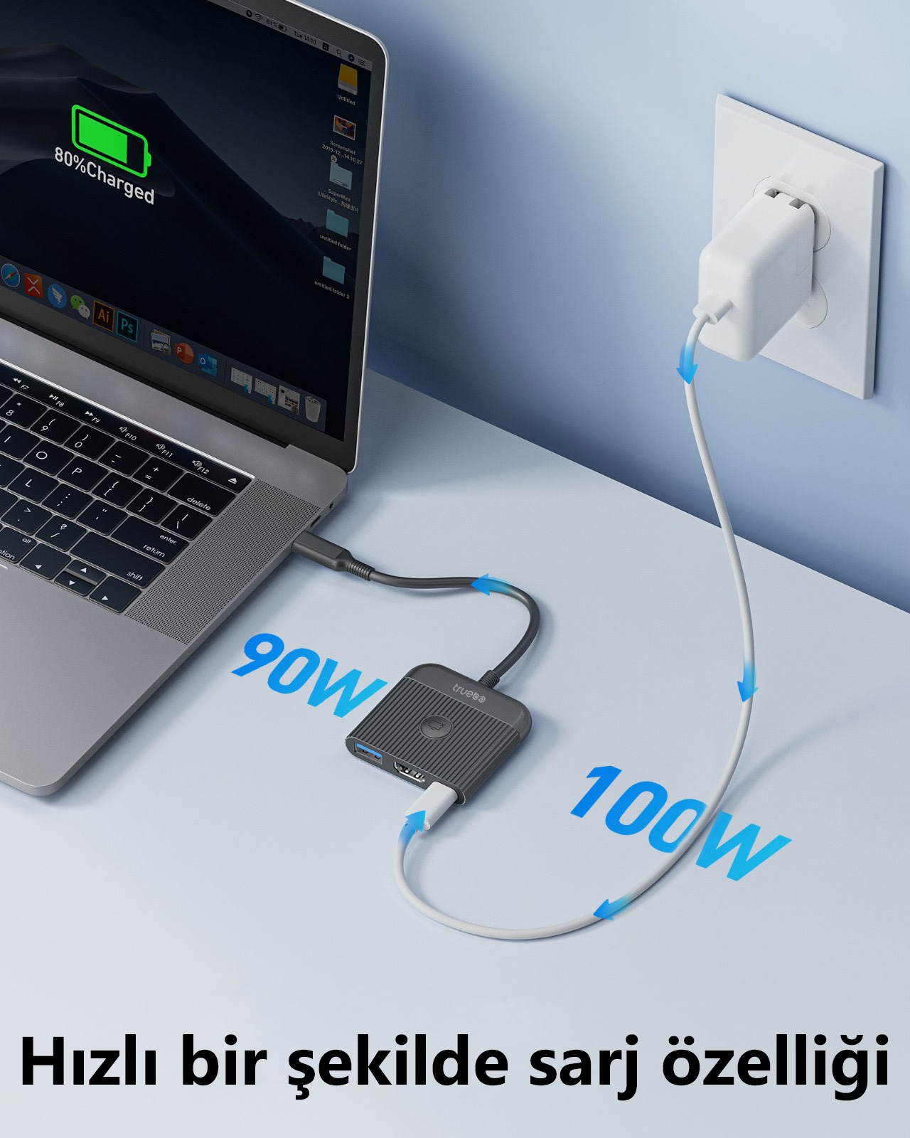 USB-C arayüzü üzerinden sağlanan 100 Watt şarj gücü, cihazınızın yüksek performans ihtiyacını kesintisiz karşılar. Özellikle güçlü dizüstü bilgisayarlar ve cihazlar için ideal bir enerji çözümü sunar.